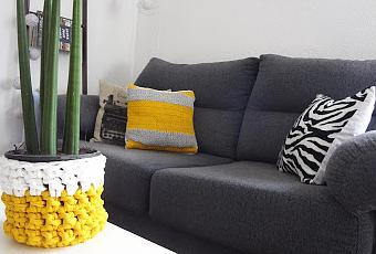 Y para acabar, como me quedé con ganas de más y me sobró trapillo acabé tejiendo a ganchillo un cubremacetas para mi cactus favorito.