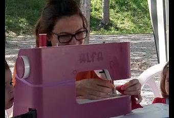 Con punto de camiseta rosa, corte un rectángulo y fabrique en pocos minutos este súper gorro, durante estos minutos las niñas esperaron junto a la máquina, observando el proceso...