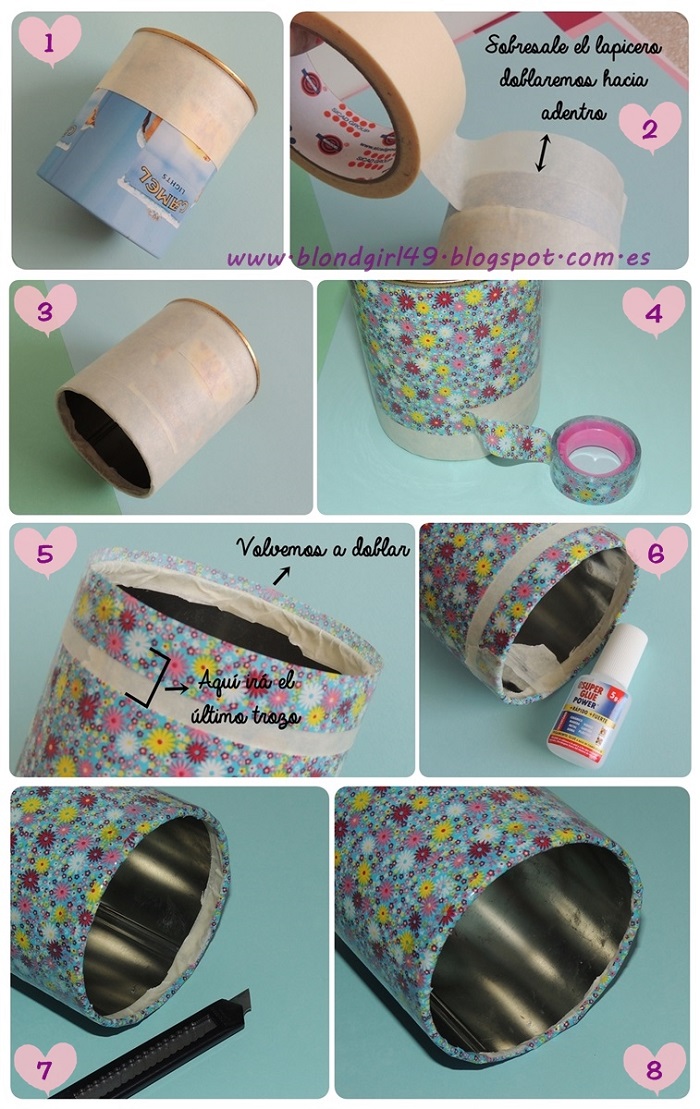 El problema de los washi tape de celo o los celos decorados es que se transparentan con mucha facilidad, con los de tela no tanto, así que para evitar que se vea el dibujo de propaganda que ya tiene el lapicero tenemos varias opciones como:1. Pintar antes el lapicero con pintura de color blanco2. Cubrirla con varias capas de cinta de carroceroPASO A PASO:1. Empezar cubriendo la propaganda del lapicero con cinta de carrocero, yo di 3 vueltas para que no se viera nada de nada el dibujo.2. Lo que nos sobresalga lo doblaremos hacia adentro,3. y recortaremos un poco con el washi tape lo sobrante, luego cuando ya tengamos el celo también lo cortaremos todavía más.4. Empezaremos desde abajo a poner las cintas de celo, una vez puesta la primera tira recortamos y luego seguiremos con una segunda fila.5. En este caso haremos igual que antes: pondremos una cinta arriba del todo sobresaliendo un poco para así doblarla hacia adentro y luego pondremos otra cinta a ras de las que habíamos puesto anteriormente. 6. Si vemos que la doblez se nos despega podemos poner un poco de pegamento extrafuerte. 7. Con el cuter recortaremos todo lo que pensemos que sobra,8. Así me ha quedado el mío una vez recortado :)