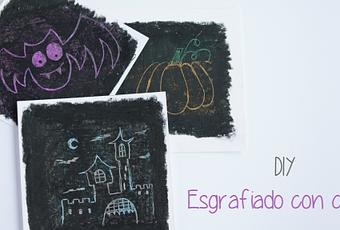 DIY para hacerte unas tarjetas para halloween usando la técnica del esgrafiado, que no es ni mas ni menos que dibujar con un palillo encima de un papel que hemos preparado antes con colores y cera negra.