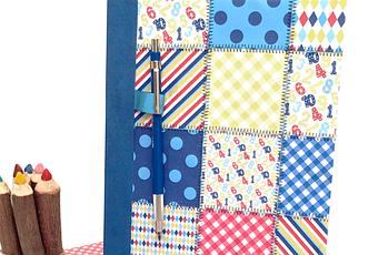 - Una vez que tenemos dos de las hojas PATCHWORK listas, las pegamos por ambos lados de cuaderno, dejando un margen para el fuelle decorativo, en el sector de lomo del cuaderno. Para adherir, usamos cinta doble contacto. Puedes usar otro tipo de adhesivo si quieres, pero la cinta es muy cómoda de usar. Las hojas PATCHWORK, deben sobrepasar por 2 cm. el borde superior, inferior y derecho del cuaderno. Estos excedentes luego los doblamos hacia el interior y pegamos.