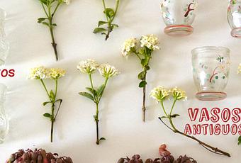 Unos vasitos de licor antiguos, harán las veces de jarrones, con estas pequeñas composiciones, podremos darle un toque de alegría a nuestra mesa!