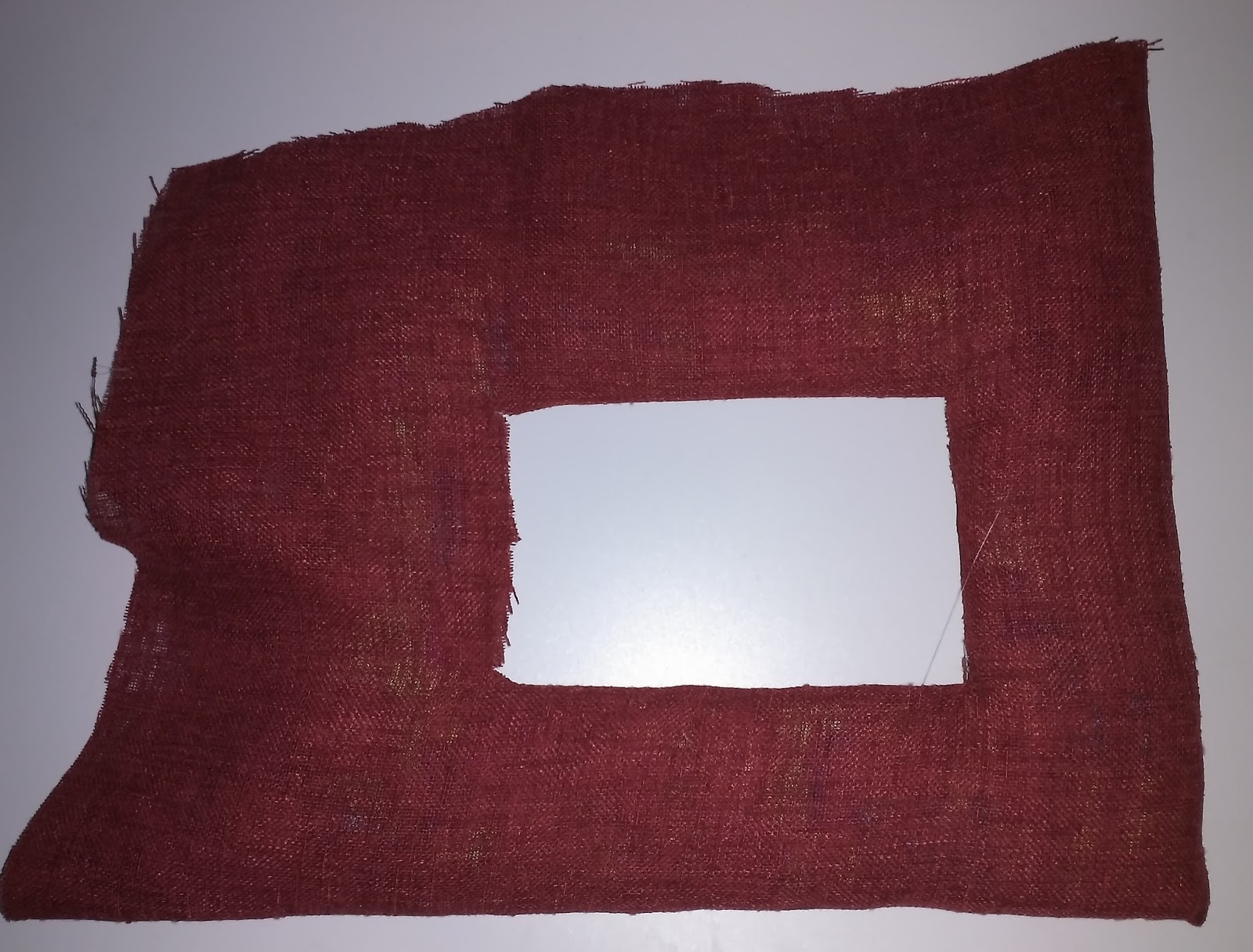 Seguiremos pegando cada uno de los lados, tanto por fuera, como por dentro. Empezaremos primero por fuera. ¿Cómo haremos la apertura central? Una vez pegado el primer lado, recortaremos con las tijeras el espacio central, dejando un dedo de tela, es decir, no adaptarnos al tamaño del marco, sino un poco más grande para facilitar el pegado interior.