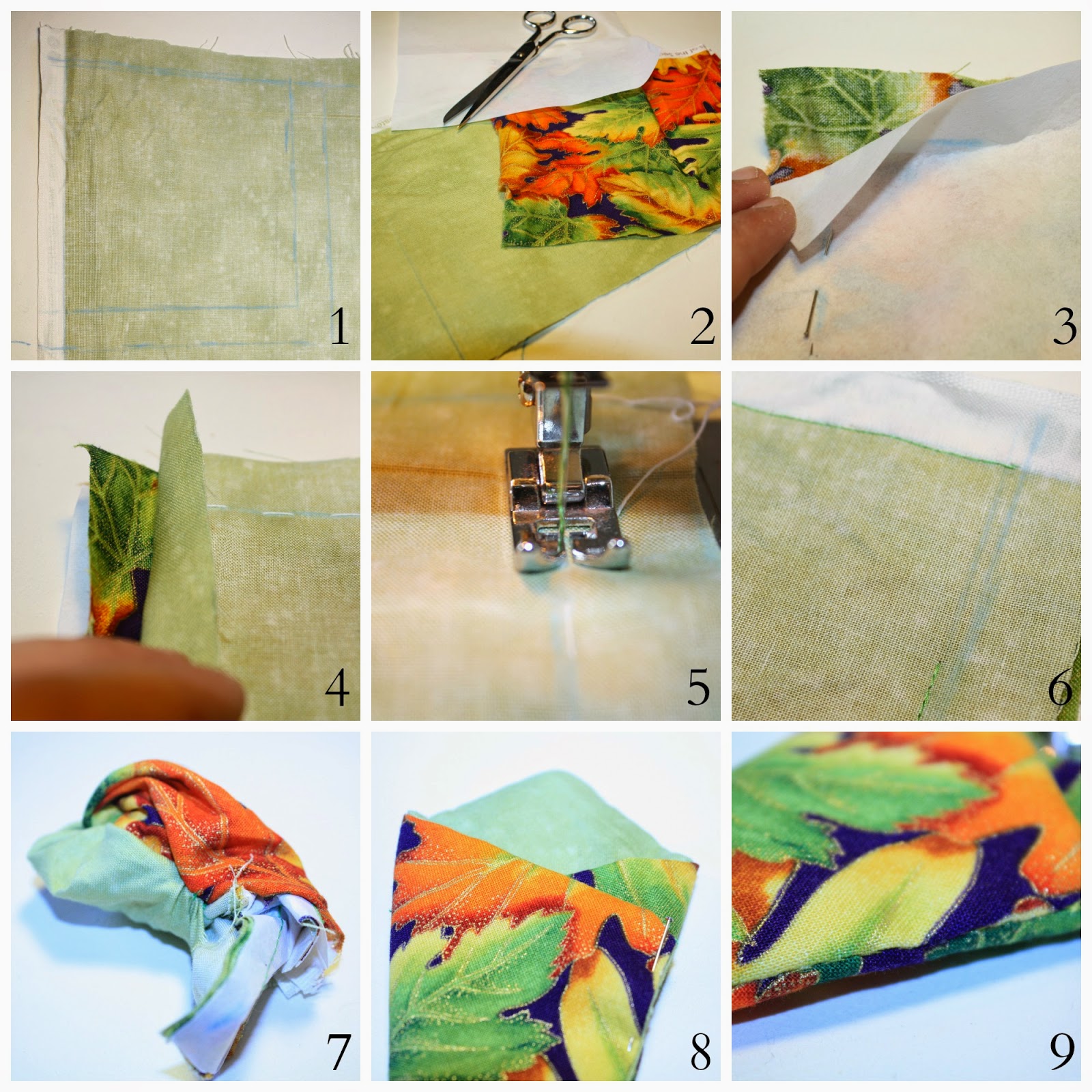 1. Señalamos con jaboncillo las medidas que queremos que tenga (aprox. 17 cm), haciendo un cuadrado y dejamos dos centímetros para cortar por ahí. ( los cuatro lados tienen que tener las mismas medidas) 2. Repetimos este paso en la entretela y en la otra tela y cortamos, y nos quedan tres cuadrados del mismo tamaño. 3 y 4. Con alfileres fijamos la entretela a la tela que se verá más, y hacemos lo mismo con la tela que hará de forro, como en la foto 4. Estas tres telas la hilvanamos. 5 y 6. Cosemos a máquina por donde hemos hilvanados, y dejamos sin coser una abertura. 7. Le damos la vuelta por la parte que hemos dejado sin coser. 8. Nos debería de quedar un cuadrado, por una parte la tela que queremos que se vea mas y por otra parte la tela que hace la función de forro. Ahora es el momento de doblar el cuadrado como aparece en la foto y lo fijamos con alfileres. 9. Ahora cosemos a mano el extremo.