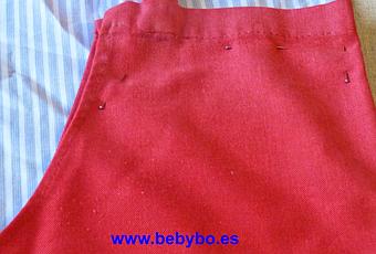 Lo primero que hice fue poner el mandil doblado a lo largo encima de la tela también doblada y del revés, haciendo coincidir las partes dobles tanto de la tela como del mandil; y ponemos alfileres todo alrededor.