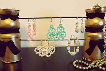 Una vez la pintura ya estuvo seca, enganché de nuevo con la pistola de sillicona, la cinta de algodón negro por los dos cuellos y posteriormente hice dos lazos que también pegué con la silicona. ¡Y listo! Ya tengo mi nuevo joyero montado.Las palitos no los he fijado porqué así puedo sacarlos y ponerlos para poder colgar pulseras que no se puedan abrir o mis pendientes después de endurecerlos para que sequen.
