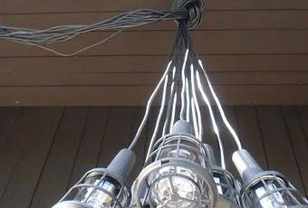 Utiliza varias lámparas portátiles de taller para crear una original lámpara de techo para el exterior. Unelas simplemente haciendo un nudo a los cables.