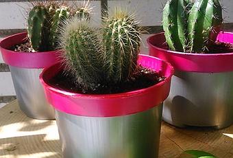 A parte de unos tiestos de plástico en color plateado necesitarás; pintura en spray color rosa neón, cinta washi-tape y por supuesto cactus o plantas pequeñas.