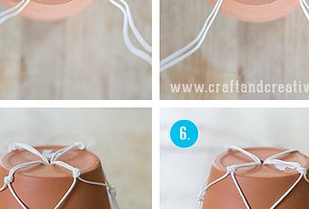 Después cortáis 8 tiras de cuerda de unos 90 cm, y hacéis un nudo en un extremo. Tiene que ser gordito (seguramente doble) para que al pasarlo por el agujero del fondo de la maceta no se salga.