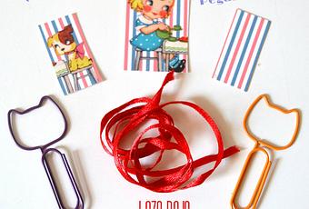 Para que quede bien pegado, he usado los preciosos clips en forma de gato que gané en el sorteo del blog Mayninetes crafty life, (creo que las tarjetas donde he pegado las ilustraciones también estaban en el paquetito, aquí no sé puede desperdiciar nada)