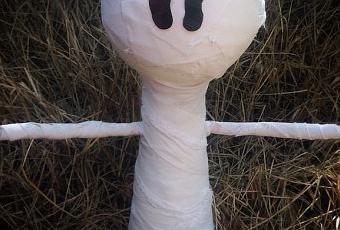 Dejamos secar completamente, hasta que la tela quede dura al tacto. Entonces podemos engancharle unos ojos de cartulina negra.