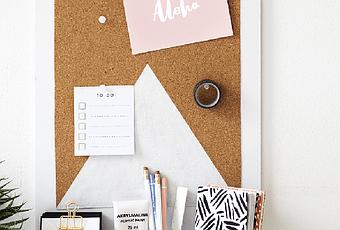 Que levante la mano quien tiene algún rincón o cajón desastre en el escritorio... ¡Dos por aquí! Así es, lo confesamos =))) Y es que hay veces que sin querer se amontonan los papeles, las notas, los recortes de revistas en plan: ¡uy esto me lo guardo que es muy interesante! Pues mirad que diy más sencillo, práctico y decorativo encontramos navegando por pinterest. Un organizador de escritorio con corcho y un bolsillo para cosas varias. ¡Es genial! Porque, al margen de tener sitios más amplios y concretos para organizar cada cosa en el estudio o la oficina, nos parece que siempre viene bien tener un lugar así al alcance de la mano. Además muy decorativo con ese toque de tendencia geométrica ¿se puede pedir más?