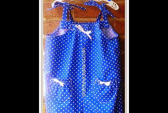 Está confeccionado en algodón con topos pequeños, el escote con frunce delante y detrás. Los tirantes anudados en lazada. Bolsillos de plastrón ( de parche ) con frunce en la parte superior.Se puede hacer largo o en corto tipo ranita como el de la imagen.