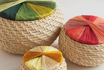 Además de las cajas redondas de mimbre necesitarás hijos gruesos de algodón. Para cada caja utilizaremos 4 colores diferentes en la misma gama. Eso sí, dependiendo del tamaño de la tapa de la caja igual necesitas más de uno del mismo color.