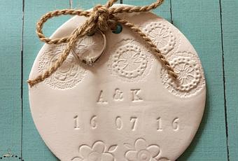 El primer paso es, amasar la arcillahasta obtener una pelota. Luego, la extendemos y amasamos con un rodillo hasta conseguir una capa lisa y del grosor que queramos. Con la ayuda de un bol o bote de cristal, cortamos el porta alianzas. Lo siguiente es, estampar unos sellos. (he usado uno de flor y otro tipo mosaico). Para las iniciales de los novios y la fecha de la boda,usamos unos sellos, los del alfabeto. Aviso que tenéis que ser bastante rápidos o de lo contrario, la arcilla tenderá a secarse. Por último, con la ayuda de un palo de brocheta o una pajita, se hacen dos agujeros que sirven para pasar una cinta cuando esté seco. Para conseguir la forma abombada, como un cuenquito (al loro con mis explicaciones) ponemos un pequeño trozo de papel film sobre un bol y colocamos sobre él nuestro porta alianzas. El truco está en empujar más o menos según la profundidad que queramos darle. En mi caso, no lo he hecho, lo he dejado plano por hacerlo un poco diferente.