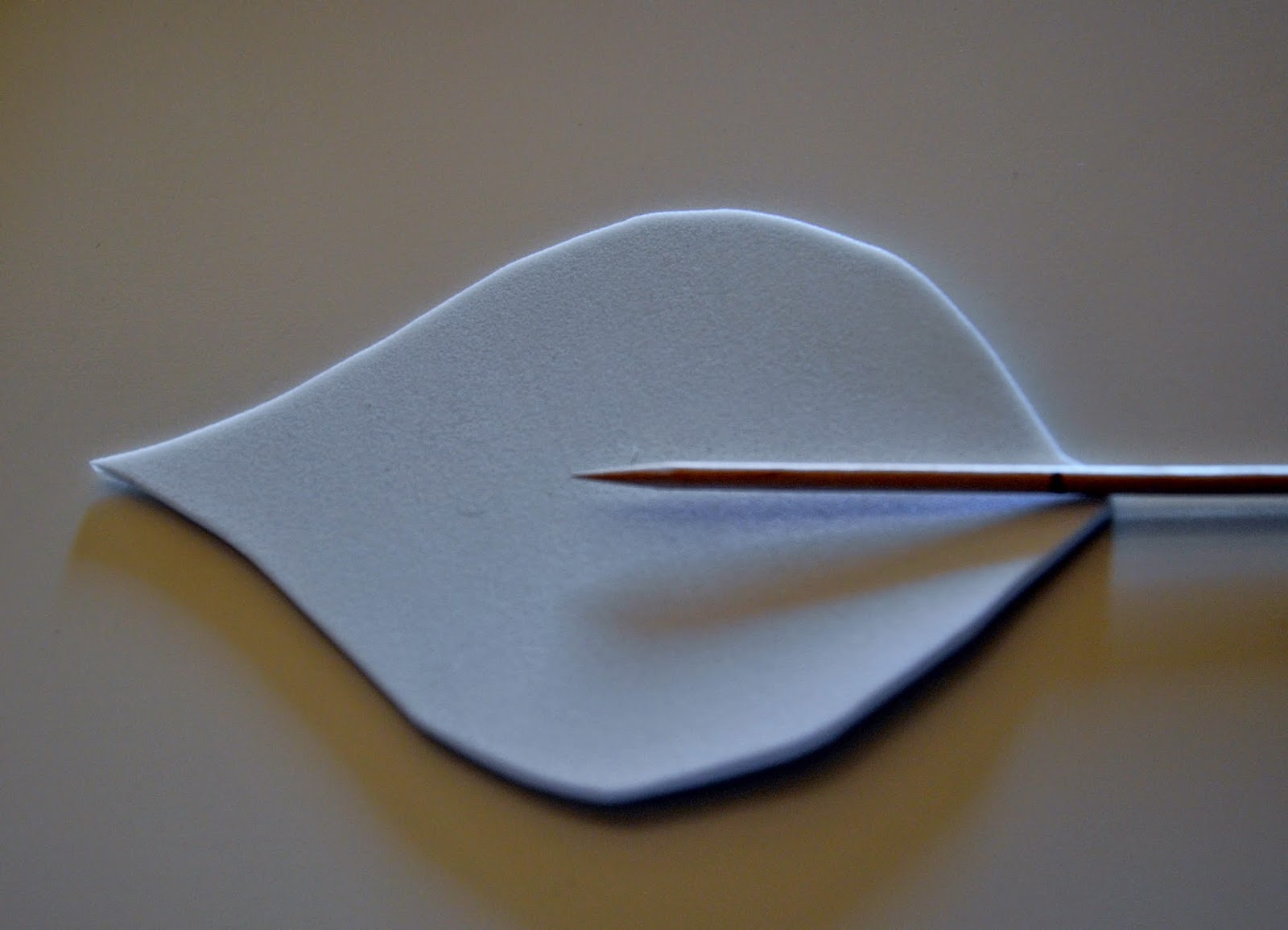 3. Posiciona, sin pegar, la espata (de color blanco) de la cala al palillo. Marca en el palillo a que altura llega para colocar el espadice (de color amarillo). El espadice lo he realizado con pasta moldeadora y lo he agujereado un poco para que parezca que tiene textura.