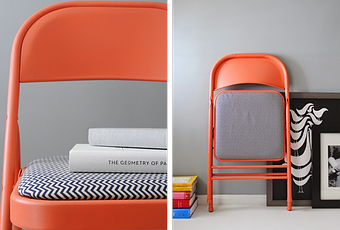 Lo primero es elegir el color de la pintura en spray especial para metal y el retal de tela para tapizar el asiento.Ahora con un destornillador desmontamos el asiento y pintamos la estructura de la silla.Con una grapadora forramos el asiento con la tela y después volvemos a atornillarlo.Ya tenemos nuestra silla plegable reciclada.