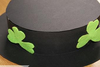 Aquí tenemos el resultado del sombrero, este lo utilizamos para nuestro disfraz de Mary Poppins añadiéndole las flores, pero como ya os comentamos, hoy vamos a decorarlo para lucirlo en Saint Patrick's Day. Nosotras hemos dibujado un trébol en un papel para utilizarlo como molde, pero se puede dibujar directamente sobre el fieltro.