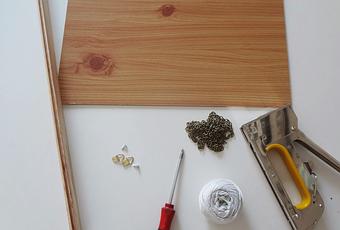 - Tablero DM de 2 o 3 mm de grosor y poco más grande de tamaño folio (del contenedor mágico)- Grapadora- Cadena y/o cuerda- Ganchos triangulares y tornillos - Madera en forma de listón con hueco en medio.