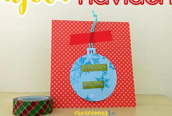 En esta ocasión, la tarjeta se abre de abajo a arriba. Con la troqueladora circular he hecho una bola navideña que he pegado a la portada con almohadillas adhesivas de scrap. Un hilo de algodón y washi tape para pegarlo. Por último, con la DYMO, he hecho una etiqueta de FELIZ NAVIDAD.