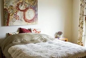 La artífice de este mural tan singular es Pam, una joven artista de Canadá que la primavera pasada pensó cómo quedaría una de las pinturas paisajísticas que estaba preparando para un calendario en tamaño grande. Y sin más (y estando ya bastante harta de su anticuado dormitorio), se puso manos a la obra para trasladar el paisaje que había pintado en formato lámina a toda una pared.