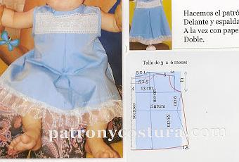 Material:0,50 m en tela batista o algodón en doble ancho. 0,50 m de tira bordada para el canesú, lazo de organza para la base 1,5 m y 3 botones e hilo del color.