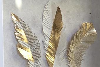 Una serie de manualidades con plumas de papel y oro, bueno color dorado. Tan sencillo como recortar figuras en forma de pluma de un libro o periodico viejo y complementarlo con pan de oro, papel dorado o purpurina. Una vez que tengas las plumas de diferentes formas, las puedes utilizar para cuadros, adornos para un regalo ....seguro que les encuentras una utilidad.