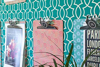 Lo primero sera empapelar la pared trasera, y seguido empapelar también unos tableros de madera fina intentando que los colores y estampados queden tan armoniosas como en las imágenes. Posteriormente fijaremos los clips como aparece en este enlace, y para finalizar los pegaremos a la pared con una cola fuerte o adhesivo a dos caras.