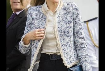 Mango presenta esta chaqueta en su catálogo combinada con vaqueros, en un estilo casual. Dña. Letizia le da un aire más formal y la ha lucido en actos oficiales.