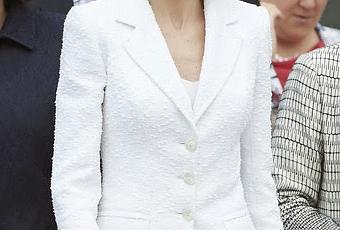 Sin duda un look correcto, sin más. La Reina adora estos estilos y le van bien, pero creo que resultan un poco austeros, pero ya sabemos que en Dña. Letizia prima la "sencillez". El blanco es un color que le favorece.