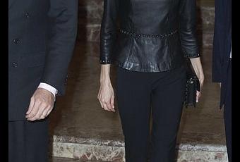 Dña. Letizia lució un estilo "rock-chic" con un top con de manga larga y aplicaciones de tachas metálicas de Uterqüe, -"inspirado" en la colección "Rockstud", de Valentino- cuyo precio es de 195 euros.