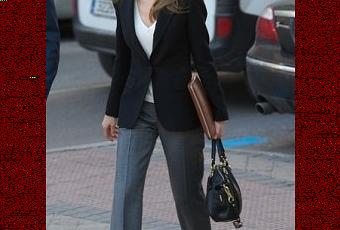 Dña Letizia se decantó por un conjunto de estilo masculino y ejecutivo: chaqueta negra, jersey de lana fina de escote en uve en tono beige, pantalones grises, peep-toes y uno de sus bolsos favoritos, el negro de Coach.