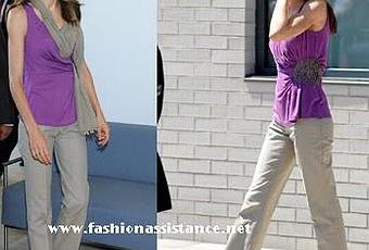 Dña. Letizia, y como viene siendo habitual en sus últimas apariciones, eligió un look de estilo informal, camiseta morada, drapeada, sin mangas y con un adorno de pedrería en el costado izquierdo, que combinó con un pantalón de color topo, un foulard del mismo color que llevaba enrollado al cuello, bolsito cruzado y alpargatas. ¿Qué opinas de este outfit de La Princesa de Asturias?