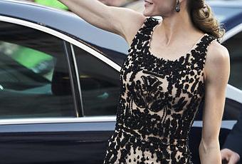 El vestido de Varela no resultó ninguna novedad, un diseño básico, con escote camiseta y línea lápiz. Lo mejor el tejido, a pesar de que el tono de fondo, rosa cady, casi se fundía con el tono de piel de nuestra Reina. Los bordados de azabache enriquecieron la tela, aunque los motivos resultaron repetitivos.