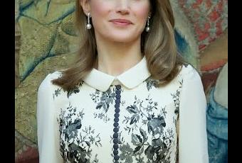 Dña. Letizia llevó este vestido en Abril de 2.012, con motivo del Premio Cervantes. Como lo describíamos entonces, se trata de un modelo blanco con encaje de blonda superpuesto, cuello bebé y manga larga, adornados con pequeños botones en el frente y mangas, una banda ancha en la cintura y con un correcto largo por encima de la rodilla.