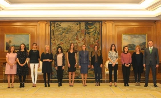 Dña. Letizia recibió en audiencia a Yolanda Sacristán, directora de la revista Vogue y parte de su equipo, y lució un traje de chaqueta y falda azul con grabado de cocodrilo, de Hugo Boss.