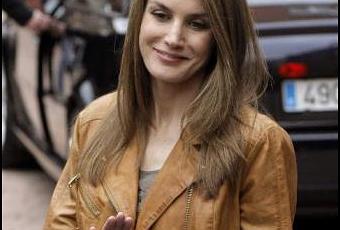 Dña. Letizia vestía vaqueros rectos azul oscuro gastados, camiseta de algodón gris con inscripciones, que asomaba por debajo de una cazadora de cuero en color whisky estilo biker, a juego con los zapatos y el bolso, con volantes fruncidos en los laterales. La Princesa no llevaba joyas y lucía su melena lisa.