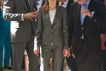 Dña. Letizia acudió a la Feria Ganadera de Zafra luciendo un look de estilo ejecutivo, un traje de chaqueta gris, que combinó con una blusa blanca de estilo romántico y bailarinas con tacón.