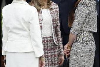 Dña. Letizia eligió un traje de tweed de cuadros granates, blancos y grises, de Felipe Varela, que combinó con top blanco de encaje (esta vez no hubo jersey de punto), zapatos de salón de ante de Magrit y bolso color topo de mano. Un look correcto y apropiado para la ocasión.