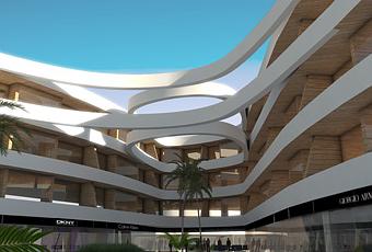 El hotel es, sin duda, una de las joyas del proyecto. Con una planta semicircular abierta, se encuentra ubicado en primera línea de playa hacia donde se vuelca con terrazas sucesivas en altura. Interiormente, espacios muy abiertos y llenos de luz, con locales en la parte baja destinados a establecimientos comerciales.