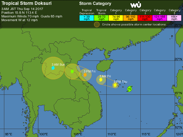 Lo más importante para destacar es que "Doksuri" aumentará su fuerza en las próximas 12 a 36 hs, con un movimiento Oeste - Noroeste y podría tocar tierra en la costa oriental de Vietnam, hacia el día viernes 15 de septiembre.