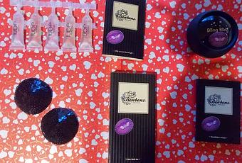 Este lote contiene: Esposas de tela, lubricantes, caramelos de menta para sexo oral, té de baño con perfume sensual, pezoneras y polvos de arroz.