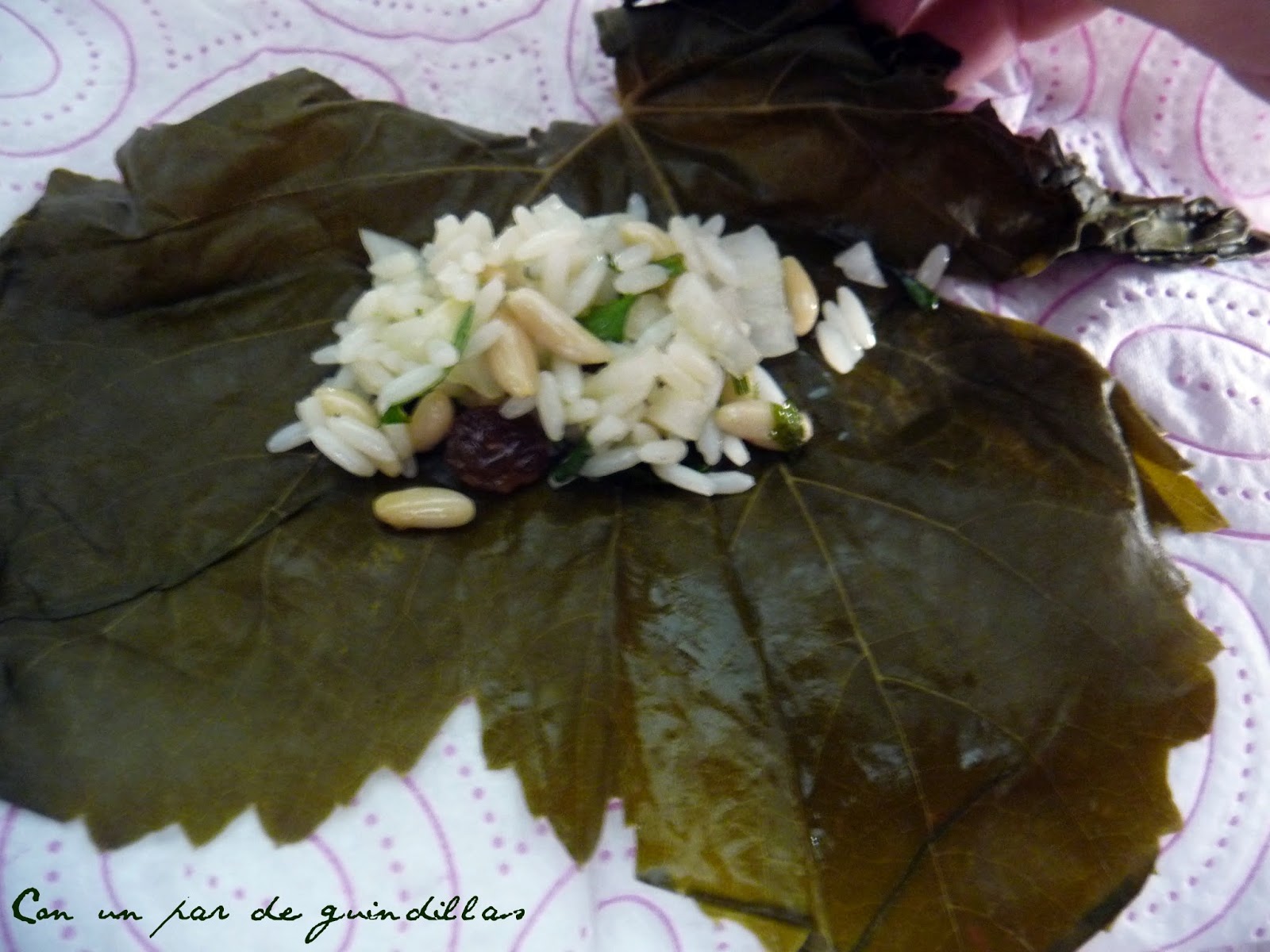 2.- Mezclamos el arroz, la cebolla, el aceite, los piñones, las pasas, las hierbas, sal y pimienta en un cuenco grande. 3.- Disponemos las hojas con la vena hacia abajo sobre la mesa o encimera y colocamos una media cucharada de relleno en el centro de cada hoja. Plegamos el extremo del tallo sobre el relleno, luego los lados hacia el centro y luego enrollamos con firmeza hacia la punta. Quedará como un puro.Hay que poner poca cantidad
