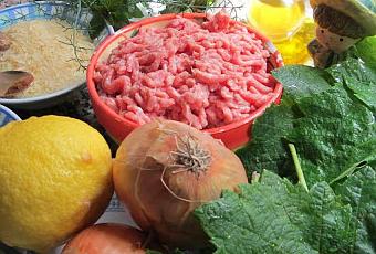 - Hojas de parra 10.- Arroz 125 g.- Cebollas 2.- Carne picada (cordero o buey) 125 g.- Pasas 75 g.- Piñones 40 g.- Hojas de menta fresca 1 cucharada.- Hojas de hinojo silvestre.- Canela molida 1 cucharadita.- Nuez moscada 1 cucharadita.- Zumo de 1 limón y otro en rodajas para la decoración.- Aceite de oliva.- Sal.- Pimienta.