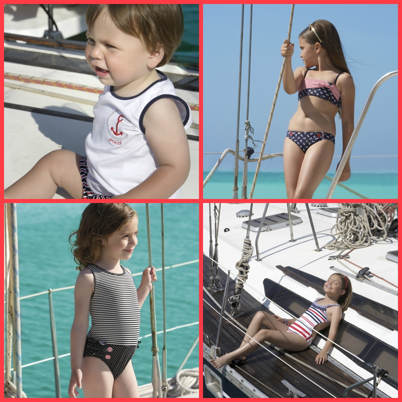 Y por otro lado tenemos una parte de la colección muy caribeña, en la que esta muy presente el animal print o los lunares maxi combinando colores como el verda agua y el rosa, esta parte de la colección es muy vistosa para los peques, presentando bañadores a modo de trikini para las niñas y bañadores surferos para los chicos.