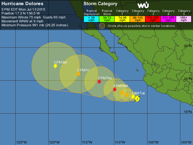 Lo más importante para destacar es que "Dolores" seguirá aumentando su intensidad en las próximas 48 a 72 hs, con un movimiento constante del Noroeste y disminuyendo su velocidad de avance. Cabe mencionar también que el fenómeno natural a medida que se mueva hacia el Noroeste, se irá alejando de territorio mexicano, según ha informado El Centro Nacional de Huracanes con sede en Miami.Otra información importante para destacar es que el sistema podría alcanzar la categoría 3 de huracán hacia el día miércoles 15 o jueves 16.