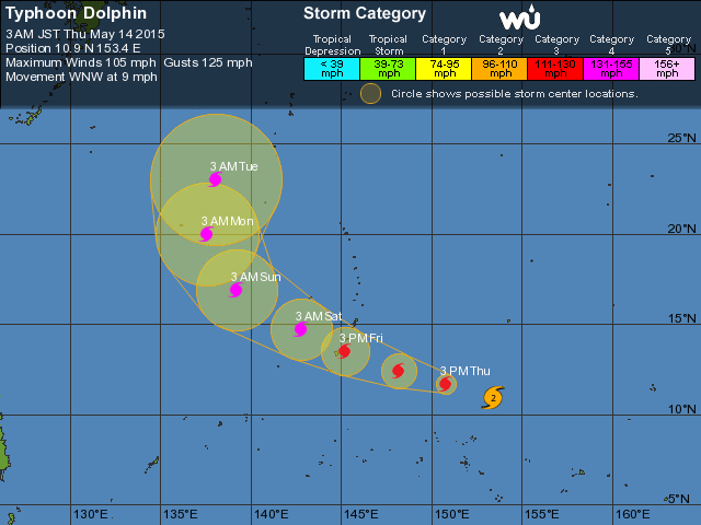 Lo más importante para destacar es que "Dolphin" seguirá aumentando su fuerza en los próximos días, con un movimiento constante del Noroeste y en las siguientes 48 hs afectará severamente el sur de las islas Marianas(EE.UU) como categoría 3 o 4.Según los modelos meteorológicos, "Dolphin" una vez que se aleje de las islas Marianas, empezará a cambiar su trayectoria hacia el Norte. Para esto falta mucho, así que hacia el fin de semana iremos actualizando la información y ver finalmente cual es rumbo que toma este fenómeno meteorológico.