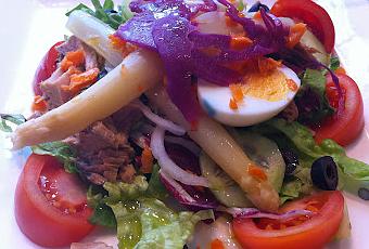 Menú del día por 12,50€ (2,50€ más que La Mary, y mejor calidad, y sin esperar colas!), donde habia ensaladas, crema de verduras, pasta, pizza, carne y pescado. De lo más completo por ese precio! Yo que soy muy tradicional y con eso de que hay que empezar a cuidarse, pedí la ensalada de la casa: mucho colorido, muchos productos, y buena cantidad. No era una ensalada muy elaborada, pero se comia bien. Y para fastidiar este comienzo de dieta, pizza blanca con queso azul y nueces (no podia ser mejor combinación). Hacia tiempo que no comia una pizza tan buena, con la masa fina y crujiente, en su punto, con mucho mucho queso azul (otro vicio mas, ¡el roquefort! ya he perdido la cuenta de los vicios que he nombrado) y unas cuantas nueces de gran tamaño, que se agradece ver lo que comes, normalmente tienen la mania en los restaurantes de triturar todo. Y para terminar con la "dieta" profiteroles con chocolate: pasables. A ver, ¿¿qué cuesta derretir algo de chocolate y poner algo más casero que esos liquidos marrones industriales que no tienen más que E-167 E-486 colorantes y vete-tu-a-saber-qué-más?? Me he inventado los "E" pero seguro que tienen uno parecido.