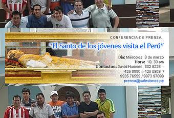 "En camino con Don Bosco” es el lema que acompaña la peregrinación de Don Bosco, Padre y Maestro de la juventud, que comenzó el 25 de abril en Turín -en el mismo patio en el que ha trabajado por el bien de tantos chicos- y que continuará por las presencias salesianas de todo el mundo. La reliquia del padre Fundador de los Salesianos estará en el Perú del 17 de marzo hasta 08 de abril del 2010.