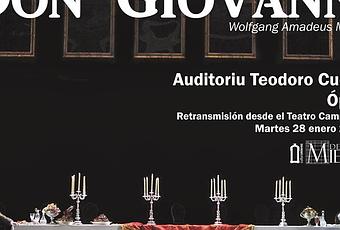 Martes 28 de enero, 20:00 horas. Auditorio Teodoro Cuesta (Casa de Cultura) de Mieres: retransmisión en directo desde el Teatro Campoamor de Don Giovanni (Mozart).De nuevo Mieres pudo ver y escuchar ópera televisada, buena entrada de los aficionados habituales pero con las mismas carencias de siempre o peores, pues solo llegaba sonido por un canal y la iluminación desde el coliseo carbayón no está preparada ni diseñada para ser televisada (si además está reciente la retransmisión del Così de Haneke en La2, sobra el resto de comentario). Así que este "Don Juan" además de no enamorar tampoco le vimos mucho y escucharlo ¡sólo a medias!. Seguir agradeciendo el esfuerzo por acercar gratis la ópera, lo que no disculpa la poca calidad de emisión y realización.
